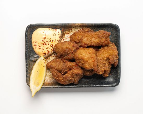 Crispy kaarage (Japanese fried chicken) with spicy mayo and lemon wedges