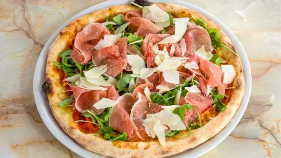 Jambon de Parme AOP, mozzarella fior di latte, roquette et copeaux de Grana Padano AOP sur une base tomate.