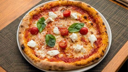Mélange de Grana Padano AOP, Taleggio, Gorgonzola AOP et mozzarella fior di latte sur une base de tomates ita...