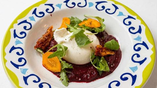 Burrata des Pouilles sur une onctueuse crème de betteraves, avec tomates confites et basilic frais.