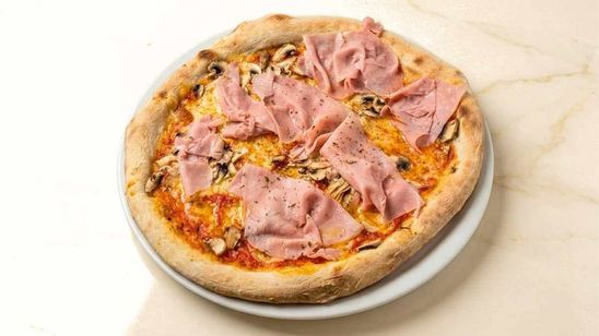 Jambon cuit au torchon Gombitelli, champignons de Paris, mozzarella fior di latte et origan.