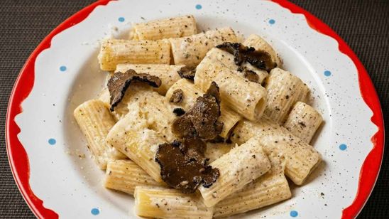 Rigatoni au pecorino, poivre noir et truffe noire pour une touche d'élégance.