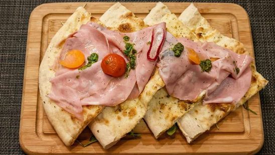 Focaccia, provolone fumé, mortadelle, pesto de basilic