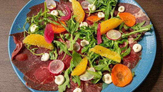 Fines tranches de bœuf, roquette, tomates cerises et copeaux de Grana Padano.