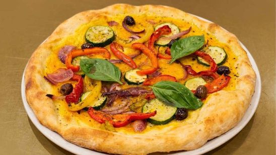 Crème de potimarron rôti, courgettes sautées, olives, oignons caramélisés et poivrons rouges.